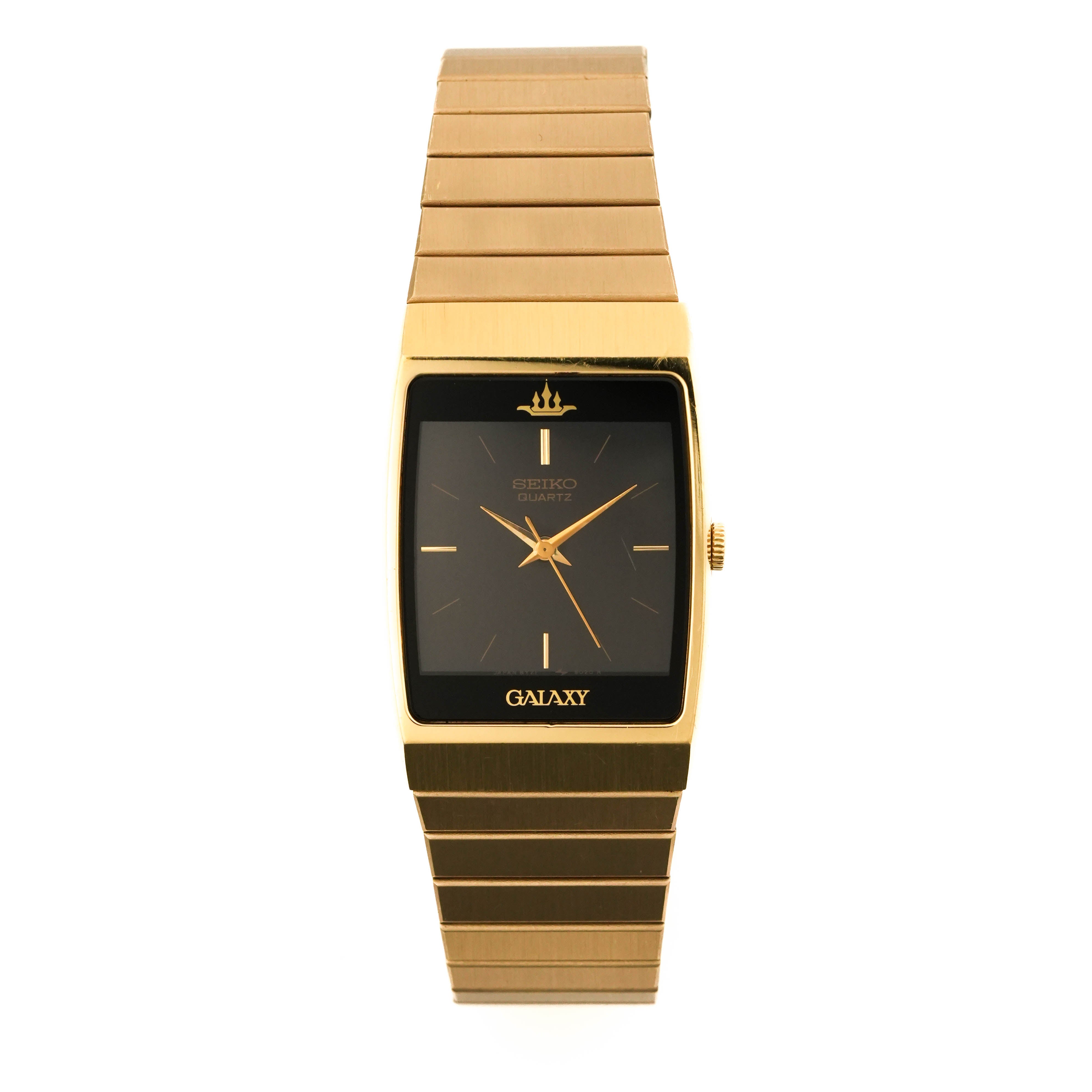 This 1988 Seiko Credero Tank, reference FC‑8Y21‑5030, pairs a slim rectangular case and roughly 22 mm black dial with an integrated gold‑tone bracelet for a seamless 80s look. The minimalist black dial with gold frame, stick markers, and 8Y21 quartz movement offers sharp legibility and low‑maintenance accuracy in a sleek, cuff‑friendly profile.