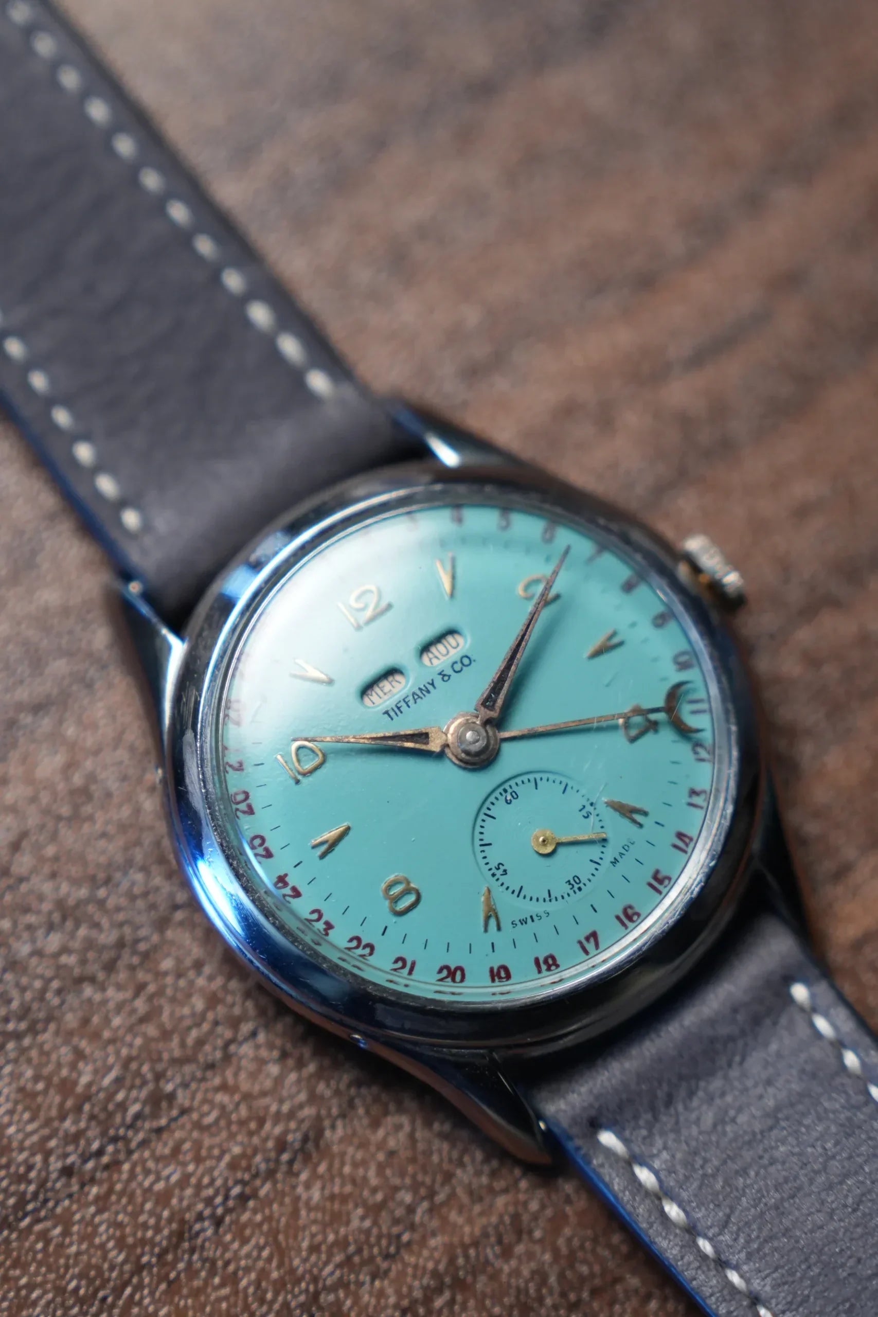 Antique Tiffany & Co. wristwatch from the 1940s-1950s, featuring a distinctive turquoise dial with gold Arabic numerals and a small seconds subdial. Housed in a classic stainless-steel case, this vintage timepiece reflects mid-century craftsmanship and timeless design. Paired with a leather strap, it’s a rare and refined collector’s piece.