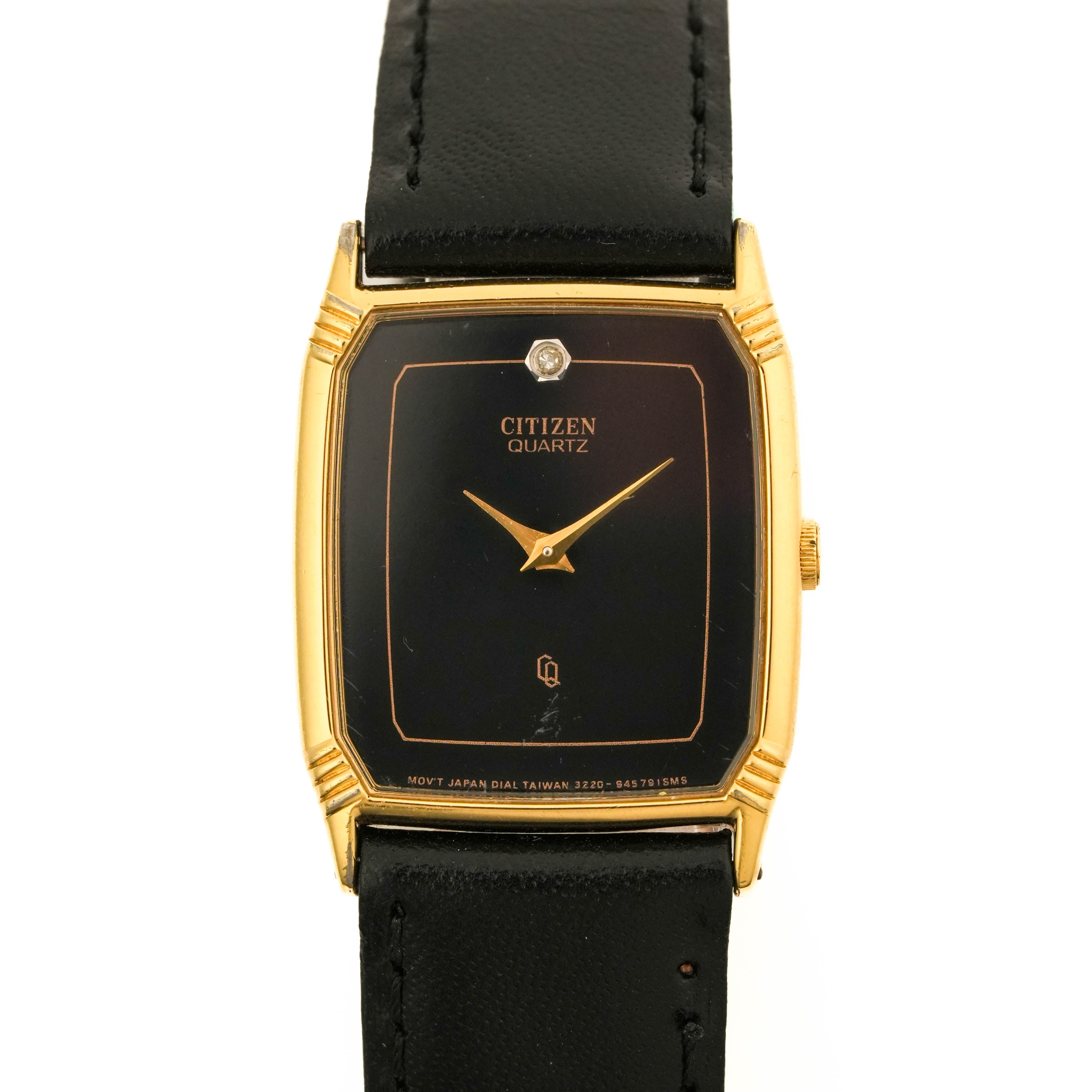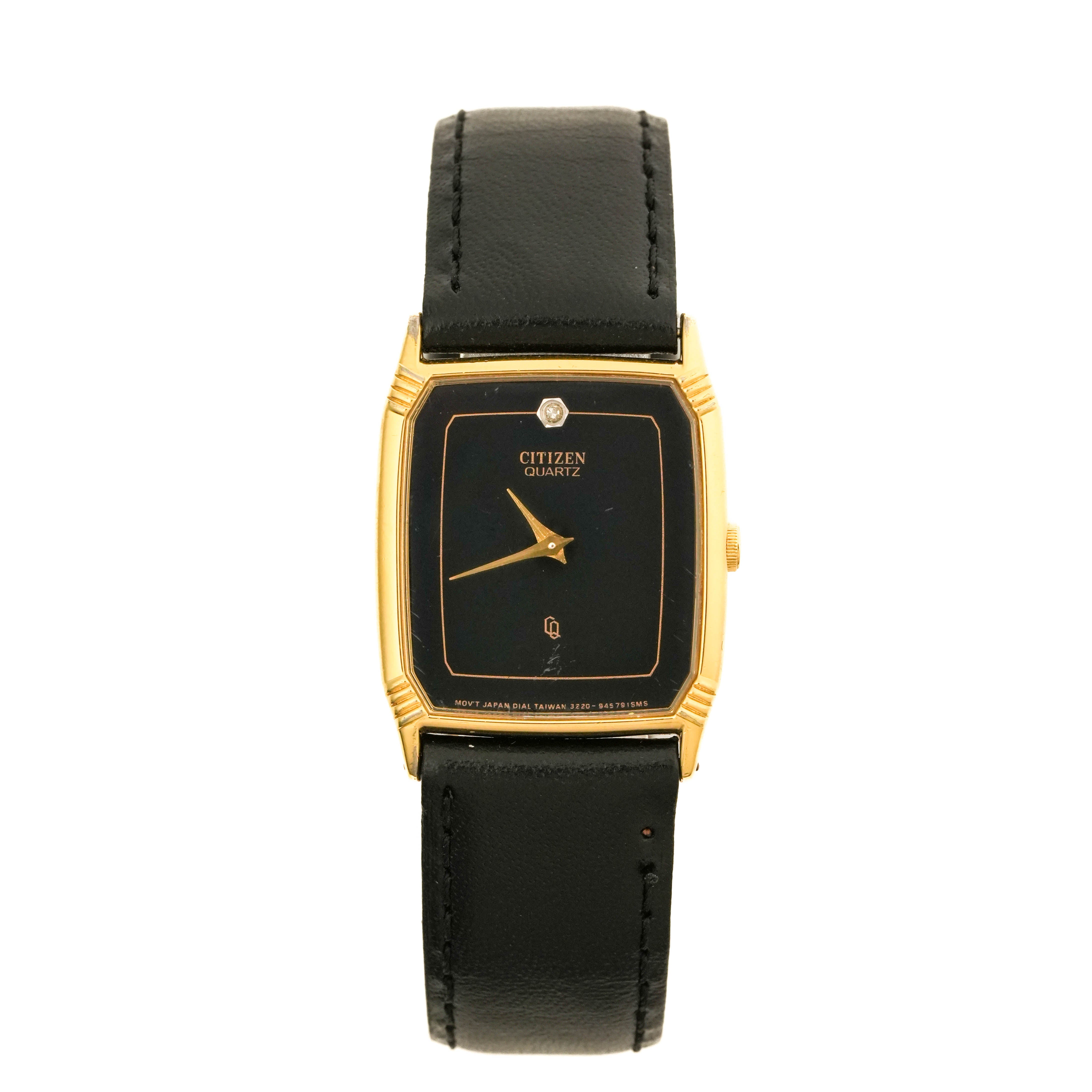 The Citizen Vintage Tank 3220-940784-70s Quartz features a slim gold-tone rectangular case and roughly 22 mm glossy black dial with gold hands and single crystal marker. Cleaned, serviced, and fitted with a new battery, it pairs a black leather strap with minimalist 1970s styling for easy dress or smart-casual use.